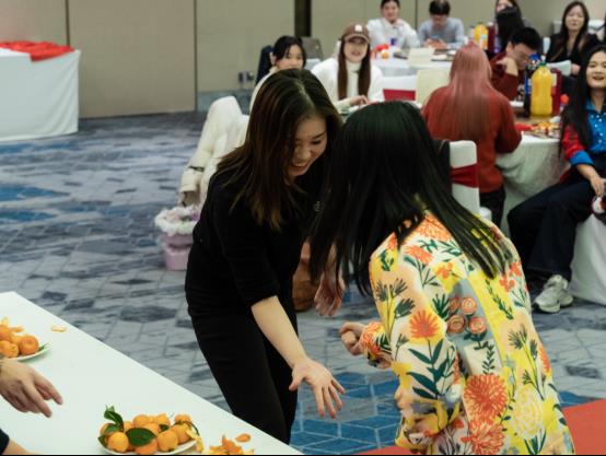 年会吃橘子互动环节超热闹!两支 7 人战队同台竞技,两两划拳定胜负 —— 赢方火速剥橘狂吃,输方即刻换人补位。盘中橘子快速减少,队员们默契接力、斗志满满,台下加油声不断。最终先清空橘子的队伍斩获 “一天年假” 大奖,这场趣味比拼既添欢乐,更显团队协作活力。