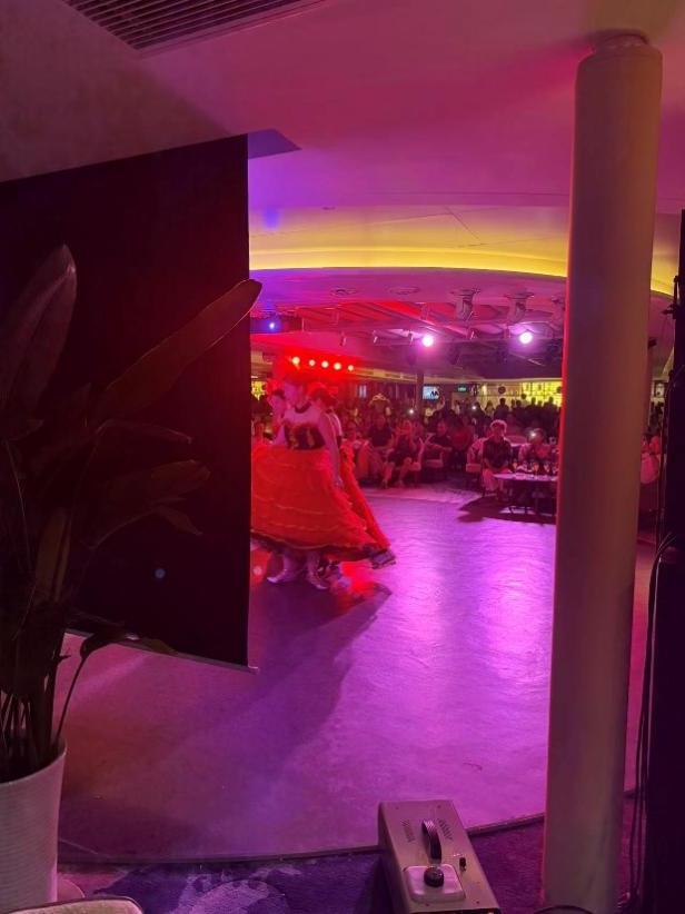 星际阿波罗号游轮的整体服务也特别好,下船和上船时都会叮嘱大家小心脚下,游览完景点回船还备了热毛巾擦手,第二天晚上船上举行了船长见面会和文艺表演,第三天晚上也安排了游客才艺表演,让每个晚上都有娱乐项目。因为到6楼会场的时间晚,只拍到舞台后面。