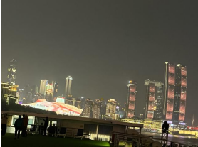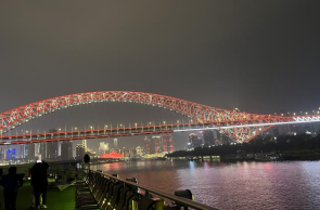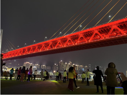 19:00 左右,游轮起航了。登上游轮六楼的甲板,欣赏重庆朝天门的夜景。朝天门被璀璨灯火点亮,宛如一颗镶嵌在长江与嘉陵江之间的明珠,横跨江面的大桥在夜色中犹如金色巨龙卧波,与对岸高楼构成错落有致的天际线。