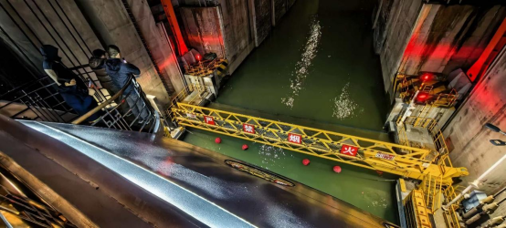 随着时间一分一秒的推进,船体驶入升船机并缓慢升起,整个过程大概由十五分钟左右,这艘大船就直线提升了100多米