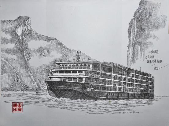 堂皇宽阔的餐厅大堂,典雅的餐桌,窗外,江山如画,船行景移。辽阔的江面,青山逶迤,美食随行...