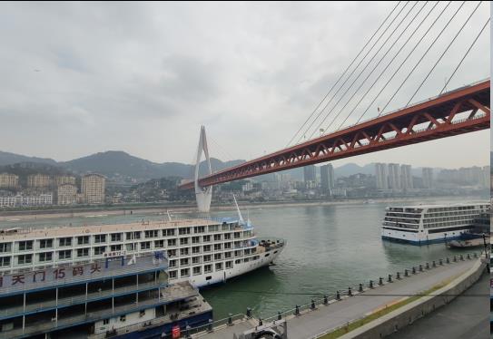 我们在朝天门15号码头看到了后面将要陪我四天三夜的长江超五星游轮美维凯娜号。一百六十米长的船身,六层高的甲板,经典的美式内河游轮,白色的船体,雄伟大气。6200吨的排水量是长江上软硬件服务品质最优的船队。