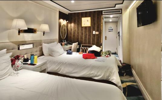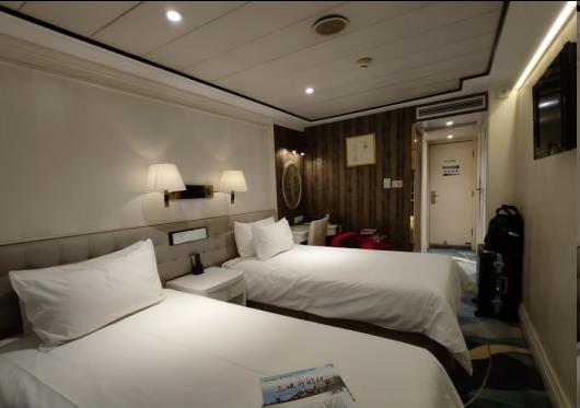 16:30分温润的江风中,我们登上了凯娜号。步入辉煌的游轮大堂,办完手续,乘观光电梯到三层人住。这分明就是五星酒店啊!打开324房间,住进了真正的江景房。