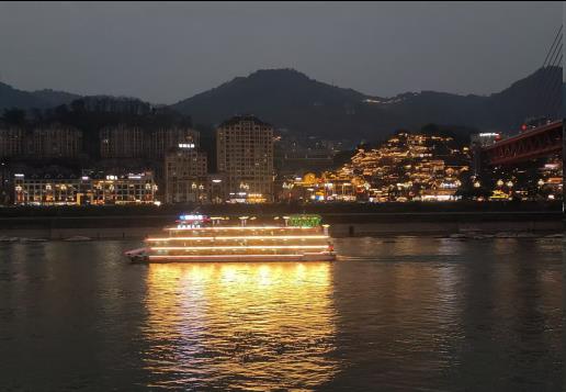 夜间江轮缓缓驶过。汽笛声回荡在冬天的江面上。极目四野,宽阔的江面上。船如织。两岸的林立高楼被灯光勾画出挺拔的身形。高高低低依山而建,光影倒映在江面上犹如碎金流淌,流光溢彩。