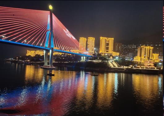 船行左舷的洪崖洞十一层吊脚楼鎏金撒银的灯光,把嘉陵江染成了流淌的金沙江。千厮门长江大桥如彩练卧波。游船驶过,搅碎满江星辰在船上回望洪崖洞的暖光,看来福士的冷辉,恍如仙境。昨天我在洪崖洞吊脚楼望江上行舟,今晚在晚风的游轮中上看它的灯火阑珊。
