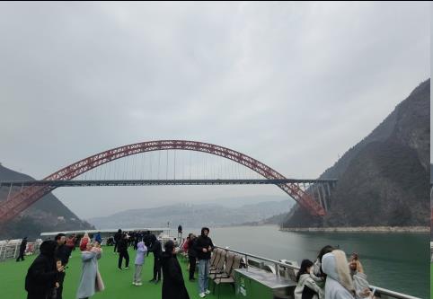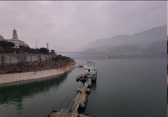 在滚滚长江中凯娜号顺流而下,行进巫峡。两岸接云连天的巍峨大山向后退去,似巨大的山水画卷徐徐延展。在冬季的长江三峡之上,更能体会到诗圣杜甫的诗句:"无边落木萧萧下,不尽长江滚滚来"的意境。