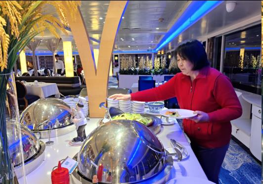 美维凯娜号。不仅是近乎到奢侈的早餐。牛奶面包、中西面点;午餐,晚餐花样翻的三峡时鲜。南北风味令人眼花缭乱,就是挑剔的美食家也不得不折服惊叹:这船上四大菜系的地道。我就被昨天的午餐中的北京烤鸭惊着啦!游客们甚至端着北京烤鸭到窗边与长江同框。惊叹"舌尖上的长江","凯娜号的美食"。