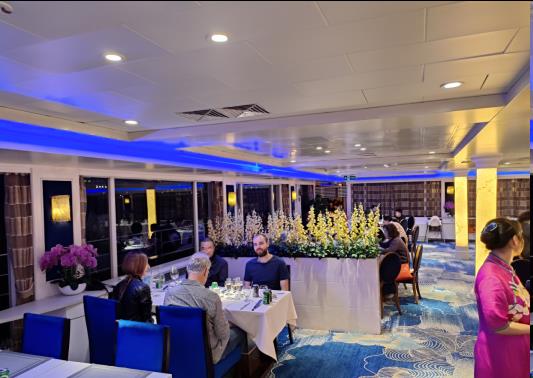 餐厅里热闹起来了,凯娜号的船长欢迎酒会正式开始。船长热烈真挚的致词 激起满船客人的共情。在香槟的碰撞声里。高潮叠起,欢声笑语不绝于耳。如果两岸有猿的话。它一定能听见满船的欢声。看见这灯光辉煌的水上宫殿。它会说:船上欢声停不住,轻舟己过万重山。等等我啊……