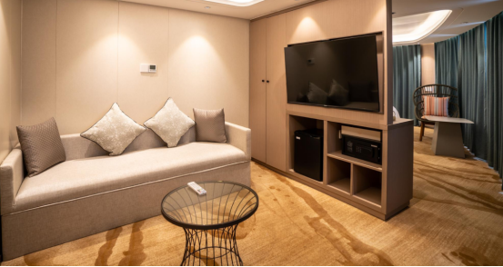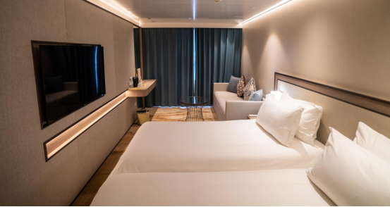 星际雅典按、星际阿波罗深谙家庭出游需求,在房型设计上展现出惊人巧思,208间(占全船房间数量99%)阳台标准间都可作家庭房使用,26㎡的房间采用三床位布局: