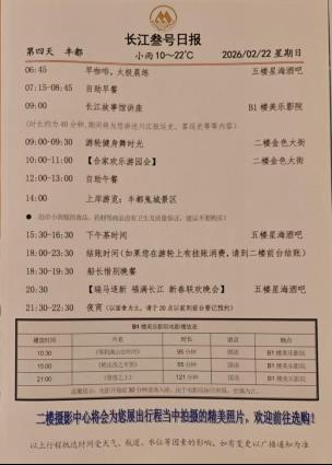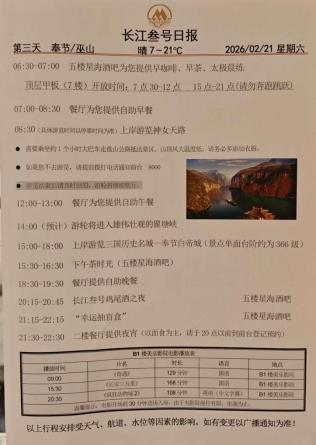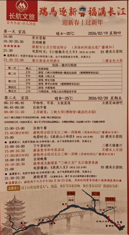 2026年春节,我跟爸妈和妹妹一起登上了长江叁号游轮,用5天4晚的时间,欣赏到了我心中最美的三峡。爸妈说,三峡涵盖了我国壮丽的自然风光,人定胜天的大国力量,还拥有井喷的古文诗句、丰富的三国文化,是一部百科全书,而我觉得,这一部书最好的方式,就是坐船欣赏。 DAY1 登船 17点我们从三峡移民博物馆出来,就直接到秭归码头了,热情的工作人员带过闸,我就看到几艘游轮安静的停在港口,是哪一艘呢? 穿过世纪荣耀,才登上我们此行的长江叁号。办理入住,行李由工作人员帮搬,我们轻松到达房间。 这次爸妈在美亚三峡游轮官网预订了挨在一起的阳台房和内舱房。床上放着安全告知,长江叁号第一晚自助晚餐丰盛可口,餐厅门口贴着前两天的行程安排。