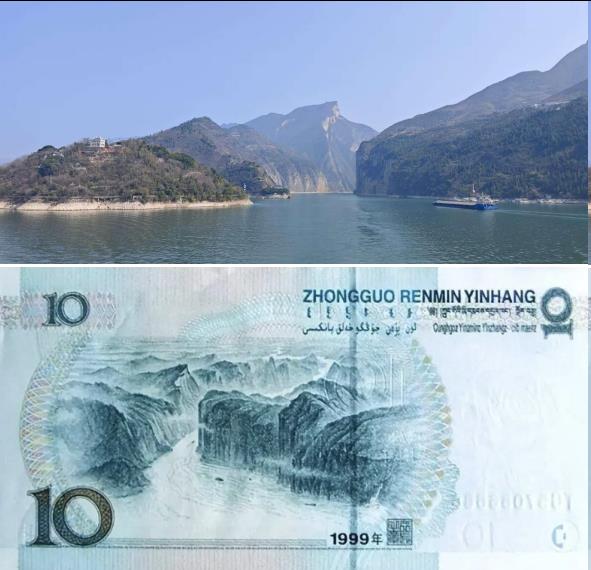 回船午餐后不久,船就进入瞿塘峡地界,这个以“雄”著称的夔门所在,没有感受到雄伟险峻,是船太稳,还是水位升高离山顶近了? 船开出峡口,妈妈给我一张10元人民币,从甲板回望这个进入三峡的第一道门,背面正是这里,非常美!