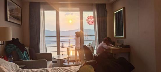 最美的是回船出发后路上看到的夕阳,就在我们阳台窗边,照得我们心里暖暖的。